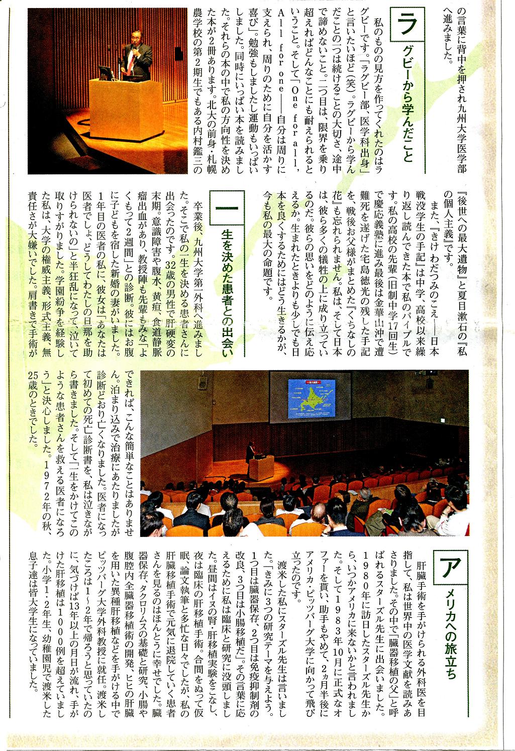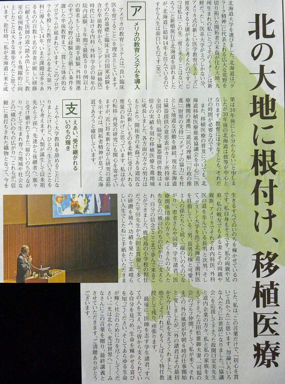 順風満帆ともいえる米国での生活を捨てて飛び込んだ開拓者の道のりは、決して平たんではない。制約の多い脳死での臓器提供などに代表されるように、自由度の低いわが国の移植を取り巻く状況。そのもどかしさを「両手を縛られたまま泳いでるようだ」とたとえ、表情を曇らせる。 それでも、帰国したことに後悔はない。少しずつだが、日本の社会も変わっているという実感があるからだ。「3年前、九州で講演した際、マスコミから出た質問は『脳死は人の死ですか』だった。今は脳死は一定の理解を得つつある」
