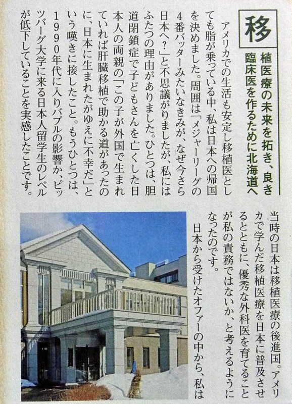 その人が96年夏、北大医学部教授会で教授に選ばれ、就任を受諾した時の周囲の驚きは大きかった。本場で脂が乗り切っているさなか、「移植途上国」に逆戻りするというのだから。